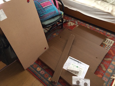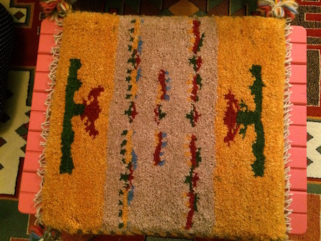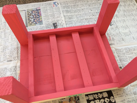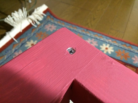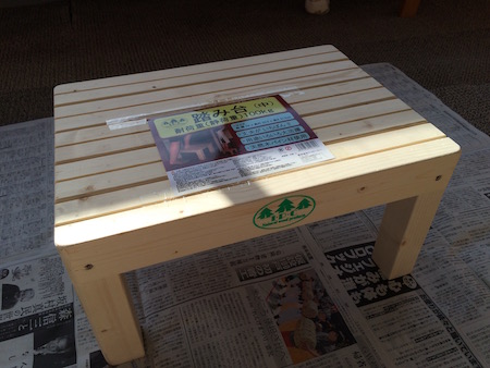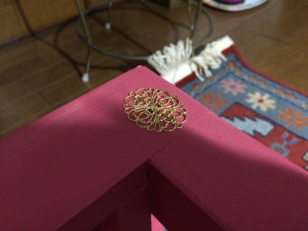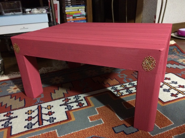 写真ブログの方に書いてたのですが、3月くらいから部屋の模様替えにはまっています。 (模様替えを企む:http://typek.blog.shinobi.jp/Entry/167/) そして最初は家具を買い換えるだけのつもりが気が付いたら切ったり塗ったり貼ったり……今はやりのドゥーイットユアセルフ略してDIYの世界の入り口に立っていました。 そんなDIY初心者のDIYログです。(ほぼ自分の日記代わり。) すてきなイージーチェアをゲットしたのでオットマンが欲しかったのですが、予算的な問題とかなり座面の低いタイプをチョイスしたのであまり気に入るものがなく自作!しました。それがこちら! じゃーん!どうでしょ立派でしょ!と言ってもまあ…… 原型コレなんですけどね。殆ど作ってないですね!! ホームセンターで売っている木でできた踏み台とか万能台とか言われているものです。大きさや素材、作りなんかで値段が変わってきますが大体1,000円〜2,000円くらいでゲットできると思います。わたしは地元のホームセンターで1,780円+消費税で。横が44cm・縦が33cm・高さが20cm程度のものです。 まずはこれを塗装。塗料はこれを使いました。 ……もちろん壁塗るに決まってるじゃないですか! まあその話はおいおいとして、塗料が余ることが分かっていたので壁を塗る前に一度塗料の感じや自分の腕前を確認すべく踏み台を塗ることにしたのです。 これ色展開がすごくかわいくて、壁じゃなくてももともと小物を塗る人向けに小さい缶もあります。 初心者でも塗りムラが出にくかったのもすごい! さて、乾く間に塗料が垂れて跡が残っても多少なら大丈夫なようにまずは裏面。 側面は塗ると新聞紙にくっつきそうなので後にします。 二度塗りする予定でしたが一度で結構色が出たので裏側は一度で済ませました。 壁に塗る場合は2時間くらい乾くまでにかかるということでしたが、木の場合はそんなにかからなかった印象。1時間くらいで手にもつかなくなったのでひっくりかえして…… 天板にあたる部分は二度塗りしてみました。あまりムラも出ずいい感じ! また1時間ばかり待って最後にツヤなしのニスをまた裏・表と2回に分けて塗って、念のため1日外で乾かして完成です。カンタンひと手間で踏み台がおしゃれっぽい印象に! がしかーし!どうにも気になる部分があります。 これ!このネジ!おしゃれ気分が台無し! 何か良いものはないか100円均一ショップ・Seriaをウロウロ……そして発見しました。 かわいいメタルのモチーフです。しかもゴールド! ピンクとゴールドの組み合わせってすごいかわいいですよね〜。しかも壁をピンクに塗ってモロカンスタイルを目指すわたしにぴったりのエキゾチックなモチーフです。 接着剤で留めました。(とても簡単な作業。) 透かしモチーフなのでよく見るともちろんネジが透けてはいますが、全体としては…… いいじゃないのいいじゃないの〜!ホクホクです。 で、何日かこの状態で使用していたのですが何か物足りない。 高さも申し分ないし、色も自分好み。しかし……もう少し快適さが欲しい。 クッションを載せてもズレるし、クッションを何らかの方法で固定してしまうと、わたしの「床座りでテーブルにもできるし本来の用途(踏み台)として使うこともできてお得」と言う目論みが崩れ去ってしまいます。何かいいもの何かいいもの……そうだ!ギャッベだ!! とってもしっかりしていてフッカフカなので、こういう小さいサイズは「座布団に!」などと売られていることもあります。これだよ!元が絨毯なのでフカフカですが踏んでなんぼ! ……と家具屋さんの絨毯フェアの片隅で8,000円するギャッベを握りしめて思いついたのですが、8,000円のギャッベはそっと戻して家に帰ってネットショッピングしました……。 結果、3,000円できちんとイラン製のギャッベを発見できました! 安いものはインド製でハンドメイドとは言え、工業的に均一なデザインで作られていて面白みがなかったのです。それに海外旅行好き、まして今年はウズベキスタンへ、いつかはイランへも行こうと思っているわたしとしては見た目で誰に分からずとも、イラン製のギャッベに足を置いて遠い中央アジアへ思いを馳せたかったのです。なのでイラン製と言う条件はマストだったのです。 だいたいどうしても5,000円以上のものが多く、もちろんそういったものは柄も細かったのですが、とりあえずそういう本格的なのは本当にイランに行ったときのお楽しみに置いておいてと言うか、ベースが1,780円の踏み台ですから!そこまでお金かけるのもどうかと思っていましたらお手頃のイラン製ギャッベをあつかっているショップを見つけることができ購入。 色も大きさもぴったり!! 一点ものなので同じ柄はもうありませんが、まだいくらか在庫があるようです。なかなかこのお値段でイラン製はないのでお得ですよ! 踏み台と縦横の長さが合うか分からなかったので上下のあるデザインが選べなかったのですが、家畜などの動物モチーフもかわいいし、長寿や子孫