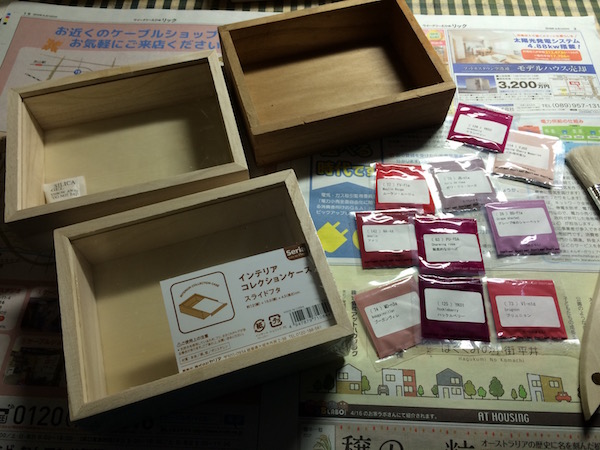自室の壁をピンクにしてしまいたい と言うものです。勢い余って先に両親が外壁塗り替えるときにピンクにしなよ!って言ってしまったので、今家の外壁がピンクなんですけどね!! 外壁のピンクに比べれば部屋の一部の壁がピンクなんてなんてことないねッ!てことで、遂に実行することにしました。 使うのは…… まあそもそも「壁紙の上から塗れる塗料がある」と知ったのが、壁を塗りたいと思ったキッカケではあるのですが。色はもうともかくピンクと言うことだけは決めてあったのですが、ひとくちにピンクと言ってもものすごくいろんな色があるわけです。 そこでサンプルを取り寄せることにしました。 無料ではないのでかえって遠慮なくいろんな色を取り寄せることができました。 こんな感じでパウチになっていて、ひとふくろでハガキ1.5枚くらいの広さを塗ることができます。本当にすごくたくさんの色があって迷ってしまいます!(イマジンウォールペイントサンプル) 悩みつつなんとなく結局これに落ち着くんじゃないかな〜と言う色は最初からあったのですが、いくらか取り寄せてみました。 で、普通はこれを白い紙か何かに塗って壁にあててみる……と言うのがいいのでしょうが、急に何だかもったいなくなってきてですね。だってぜんぶきれいな色だし。紙だったら使えないから捨てることになっちゃう。ハガキ1.5枚分かぁ〜と思ってこちらを用意しました。 Seriaで100円で売っている木の箱! これに色をつけたら後から何かに使えないかな?と言うことで。しかしまあ100円で透明のフタ付きの木の箱が買えてしまうとかびっくりですわ〜。 で、1時間とかからず塗り終わりました。 どの色がいいかな?もですが、見たらお分かりかと思うんですけど、色によって塗りやすさが全然違う!透明度が高いと言うかなんて言うか、白の混ざっていない色?の方がムラが出やすく塗りづらかったです。そういうのが分かったことも含めてやはりサンプルを取り寄せてよかった〜。 でもあんまり白味が強過ぎるものは、今回部屋の壁全てを塗るわけではないのでアクセントにならないかなってことで排除、この3つから選ぶことにしました。 すごく無理矢理壁へオン。 でもまあこうして見るとインテリア小物としてすごい使えそうな感じしますよね!この箱! 日中、電灯下、蛍光灯下、いろいろ検討して結局は最初に本命かな〜って思ってた色にしたんですけどね〜。いちばん右のブリュニョンと言うピンクです。 まあ販売サイトの「モロッコインテリア特集」で使われてた色なんですけどね! そう、わたし壁をピンクにしてちょっとエキゾチックなお部屋に模様替えしたいのです。 さてさて目論見は成功するのか!? そうそう、この塗料、壁紙の上から塗れるのが売りではあるのですが、ものによっては塗れないものもあると言うことなので…… お試し塗りです。無事定着して乾いたら濡れたタオルで拭いても取れなくなりました。 さあこれでもう後戻りはできないぞ!! 着心地重視のパジャマです2016/05/31 (Tue) 19:29 - ファッション そろそろ梅雨入りですしじめっとした時期にも気持ち良く着られてお手頃なパジャマ……と思って探したらここに行き着いてしまいました。ええ、 ババア臭いですよデザインは!! 安いので母も欲しいと言うのでいっしょに買いました。Lサイズは紫しかなく完全にババアパジャマですとも!わたしは黄色と紫を色違いで買いました。黄色はややババアっぽさがやわらぐものの、今度はペイズリー柄が災いしてなんだかガラ悪そうな雰囲気を醸し出してきます。 でも!!着心地はものすごくバツグンです!! パンツのゴムなんて幅広で当たりが柔らかく食い込まないようになってるしね!! 肌触りもものすごくいいです。 日本酒:あさ開・冷酒飲み比べセット岩手県の酒蔵なのですが、冬に出る新酒はもちろん季節折々のお酒、それに定番のお酒、どれもおいしいごはんや肴に合ういいお酒ばかりでついついよく買ってしまいます。 今回は送料無料になる冷酒の飲み比べセットとついでにちょっと日本酒好きとしては邪道かな?と思いつつ、ブルーベリー味のスパークリング日本酒をお試しで。 わたしも最初に飲んだのはスパークリングの日本酒度の低い飲みやすいお酒だったのに、今は原酒とかきくと、え?飲みたい飲みたい!とか言うようになってしまいました……。 でもそんなに強くはないので、お取り寄せで自宅でゆっくり美味しいお酒が飲めるのはうれしいものです。 ウズベキスタン・ガイド発見するや否やぽちってしまいましたこの本。今年はウズベキスタンに行くんだ〜!! 早くから本読んでわくわくしたいのに、歩き方先生が8月以降に改版予定なんだよネとか告知しているものだから、買ってもすぐ新しいものが出てしまう……と手を付けられず。 でもなんか見たい!見てここもあそこも行きたいとかなんとか言いたい! ネットでもそら情報は集められるのですが、やっぱり紙の本のわくわく感は違います。そ