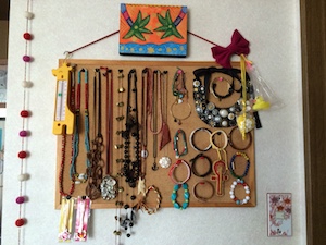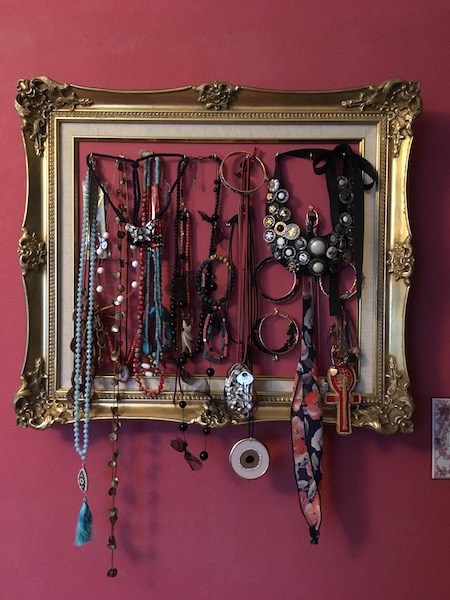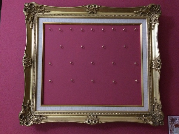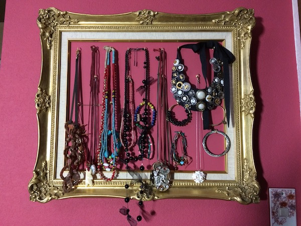 増え続けるアクセサリー、できれば場所を取らずそして見やすく選びやすく収納したいものですが、わたくしは以前このような感じで収納しておりました。 ……確かに省スペース!見やすい!選びやすい! しかし如何ともしがたい昭和感。 なんでしょうこの昭和の中高生ががんばった感じ!? オカンが捨てようとしていたわたしが生まれた時に買ったキリンの温度計が更に昭和感に拍車をかけていますが!これはどうにかしたいところ! いろいろ考えましたが、壁面を使うアイデアはそのままとして、このようなものを用意しました。 ①油彩額縁 こちらはヤフオクで中古品を3,000円程度でゲット! 美術の知識は全くないので画材屋さんのサイトでキャンバスの寸法を見ながらなるべく設置予定の壁に対してバランスが良く大きいものってことでF8号で、金縁でアンティークな雰囲気があってなるべくお手頃で……と連日検索し続けてゲットしました。 新品は高いですし、中古品の方が適度に馴染んでて使いやすいと思います。 (→ヤフオクの油彩額検索結果へ) ②額縁に合うサイズのキャンバス F8号のキャンバスです。そんなに高くありません。 amazonはプライム会員になれば日常の細かい買い物もだいたい送料無料でできますし、ちょっと近所にはないようなこういったものも簡単に買うことができて便利です。 わたしは買うものによってamazonと楽天使い分けてますね。 ③塗料 わたしは壁塗るので2L&壁塗り道具セットを買いましたがね! 壁塗りの練習としてオットマンを自作してみたのですが、不器用でも非常に塗りやすく扱いやすい塗料でした。また有料でサンプルを取り寄せることができ、色確認しながら小さいインテリア小物なら塗れてしまうので、ちょっと気になるくらいの段階でも気軽にお試しできます。 参考:DIY日記:オットマンを作っ……たのか?(踏み台に塗装) 参考:DIY日記:壁をピンクにしてしまおう!①〜サンプル取り寄せ〜(サンプルレビュー) さて、モノさえ準備できれば出来たようなもんという超カンタンDIYです。 (夜作業してた部分があるのでちょっと写真が暗いです……。) まず購入した油絵用額縁のガラスを外します。 そしてキャンバスに塗装。 ムラなくくっきり発色させたかったので乾くのを待って二度塗りしました。 キャンバスを塗るだけでなんだかおしゃれ感が漂って来ませんか!?(来ないか。) そして額縁へはめこみます。 これはおしゃれでしょう!おしゃれと言ってください!(懇願) だって見てくださいよ!同じ色に塗装した壁にかければ…… 漂うモダンアート感! おしゃれ!誰がどう見てもおしゃれ!!(暗示) なお壁がピンクになっているのは並行作業していたからです。 しかしここで重要な問題があります。 このままではアクセサリーが収納できません。 そこで最後の材料を用意します。 金色のヒートンです。 ホームセンターなどで数百円で購入できます。 色はお好みで良いですが、額縁の色に合わせて金色にしましたが古美色とかでも良かったかも。 これを収納したいアクセサリーを当てがったりしながら(これ重要)お好みの間隔でブッ刺していきます。誤算だったのは刺しただけではグラグラして使用に耐えない状態だったこと。 一瞬焦りましたが根元を瞬間接着剤で固定したところしっかりしました。ホッ。 キャンバスを塗装して額縁にはめるとこまではすぐ思いついたんですが、キャンバスにどうやってアクセサリーをひっかけるところを作るかは実は少し悩んだのでした……。 で、完成です!カンタン!! 何もないとちょいと間抜けですが、これにアクセサリーを飾り付ければ…… ほらおしゃれ!ほらおしゃれ!!…………ですよね? たくさん収納できた方がいいし、こういうのはぎっしりごちゃっといくほうがセンスが要らないのでもう盛れるだけ盛っています。1枚目が作成直後で、2枚目は何ヶ月か前の状態で、今はまたちょと収納しているものが違います。(明らかに物量が増えているな……。) わたしは海外旅行好きで旅先でアクセサリーを買うことが多いので、普段は仕事柄あまりアクセサリーはつけていませんがこうしてかわいい旅の思い出が毎日目に入るだけでもテンションが上がります。なのでこの収納方法はとてもおすすめです。 で、最近ちょっと考えているのがこれもうひとつ作りたいな〜と言う。 キャンバスにヒートンブッ刺す代わりにこれを貼り付けたら、大ぶりなリングやピアスも目に見えるように収納できるんではないか……?と。イヤくりぬけたらベストだな……でも難しいかな……とか細かいやり方は考え中なのですが。 あとね、小さい額縁にひとつだけセットして本当に絵画のように飾るのも良いと思うんですよ。プレゼントするジュエリーやアクセサリーをセットして……と言うのもいいんでは。 と言うかキャンバスがジュエリーボックス+ジュエリーの重みに耐えきれるか分かんないので(たぶん大丈夫と思うけど)、小さいので試したい! ただお手頃な中古油彩額があるタ
